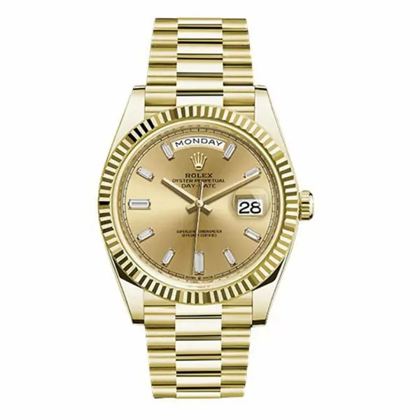 The champagne dial of the Rolex Day Date 228238 CHBDP exudes a sense of opulence. The hour markers are adorned with 10 baguette diamonds, adding a touch of glamour to the timepiece. The baguette numerals are clear and easy to read, enhancing the watch’s functionality.