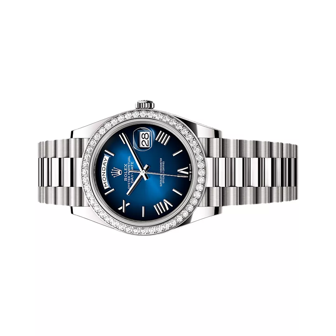 The captivating blue ombré dial of the Rolex Day-Date 40 228349RBR-0045 transitions seamlessly from deep to lighter hues, creating a striking visual effect. Adorned with diamond hour markers, the dial exudes refinement and exceptional craftsmanship. The signature day display at 12 o’clock and date window at 3 o’clock—hallmarks of the Rolex Day-Date series—ensure practicality while maintaining its luxurious aesthetic.
