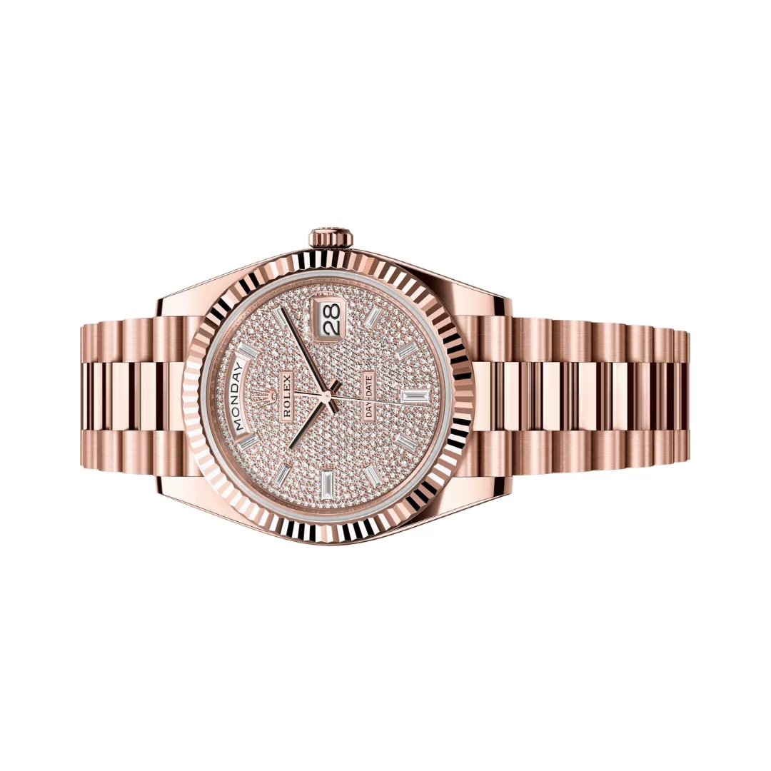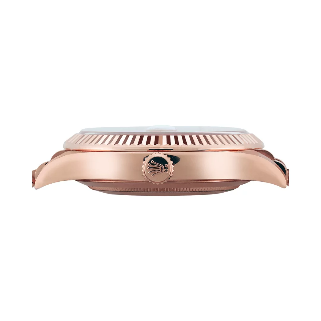 The Rolex Day-Date 40 Oyster Perpetual 228235-0036 is a luxury men’s watch crafted from solid 18ct Everose gold. The 40mm Oyster case has a monobloc middle section, screw-down case back, and a screw-down winding crown. It also features the Twinlock waterproof system, making it waterproof up to 100 meters (330 feet). The fluted bezel and scratch-resistant sapphire crystal with a Cyclops lens over the date add to its refined look.