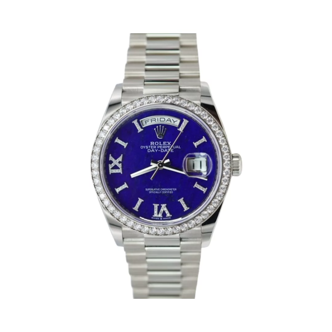 Designed for women who value classic style, the Rolex Day-Date 128349RBR is a marvel of luxury and craftsmanship. This 36mm timepiece, which combines traditional Rolex design with contemporary elegance, is crafted in white gold and radiates luxury. A distinctive and colorful touch is added by its eye-catching lapis lazuli blue dial, which improves readability and style.