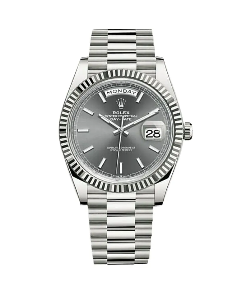 The slate grey dial of the Rolex Day-Date m228239-0060 serves as a captivating backdrop for the timepiece. The applied polished white gold index hour markers, filled with luminous material, offer excellent legibility in various lighting conditions. Complementing the hour markers are the polished white gold hands, also filled with luminous material, providing a stunning contrast against the dial.