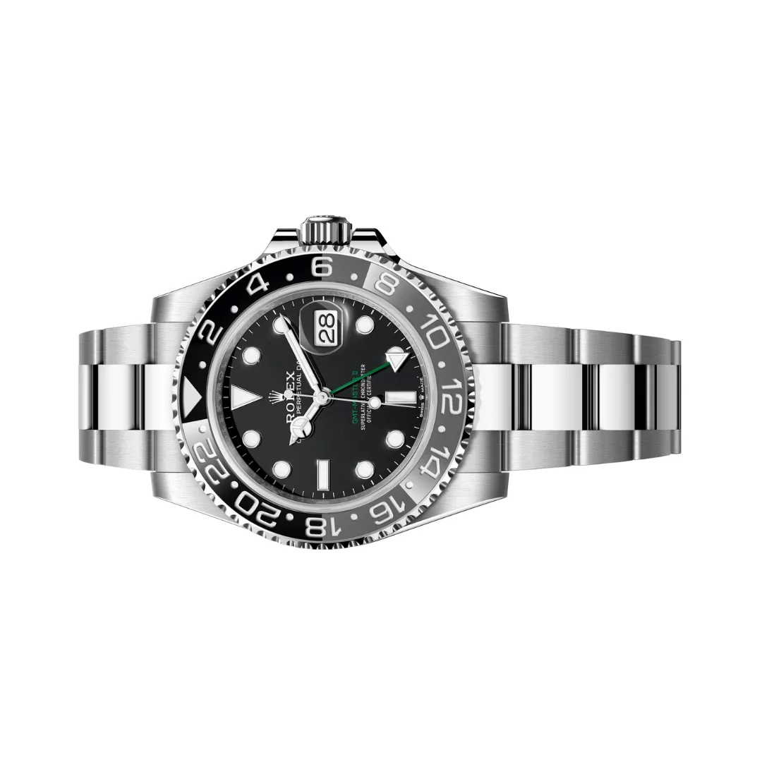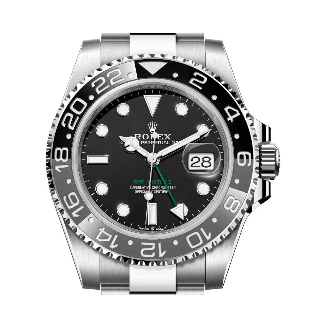 The green and black ceramic bezel adds to its bold, distinctive design, evoking the spirit of the renowned Bruce Wayne. Rolex Gmt Master II 126710GRNR-0004 wristwatch not only reflects precision and dependability, but it also has a sophisticated appearance that appeals to both collectors and enthusiasts of luxury watches. With its perfect blend of innovation and classic design, the Rolex GMT Master II Bruce Wayne is a timeless masterpiece of horology.