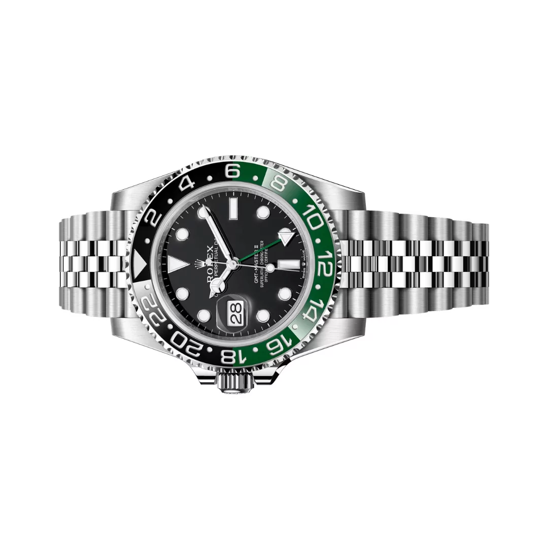 Rolex GMT Master II Sprite 126720VTNR in 40mm Oystersteel has a green and black ceramic bezel, a left-hand crown, and a Jubilee bracelet. Its left-handed crown combines Rolex’s heritage with a contemporary dual-time function for a striking, everywhere.
