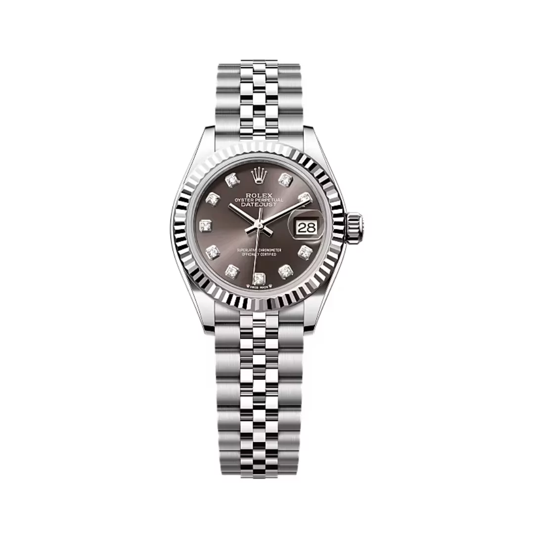The dark grey dial of the Lady Datejust 279174-0015 is adorned with diamonds, adding a touch of glamour and sophistication. The diamonds are set in 18 ct gold settings, creating a stunning contrast against the dial’s background.