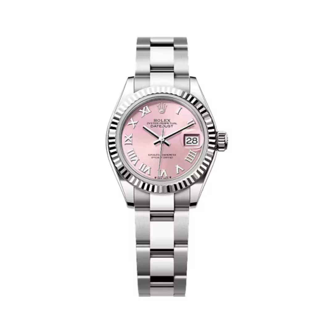 This model has the magnificent Rolex Oystersteel-White Pink Dial, which is a delicate and bright tint that captures light beautifully while conveying warmth and sophisticated elegance. The exquisite 28mm Oystersteel and white gold case is durable with a polished finish, making it a lifelong treasure. The fluted bezel gives a touch of classic Rolex design, while the sleek Jubilee bracelet provides both comfort and sophistication on the wrist.