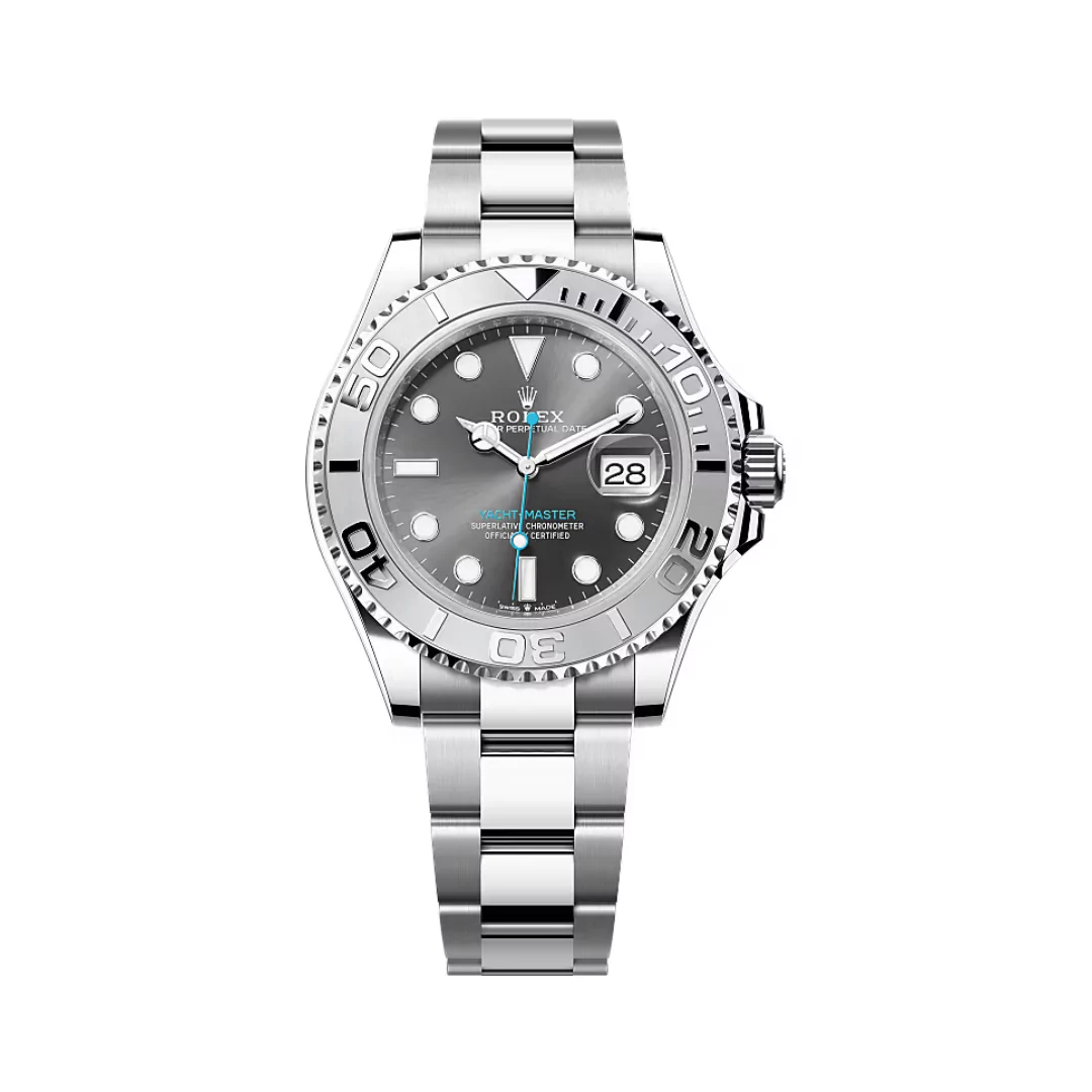 The Rolex Yacht Master 126622-0001 Dark Rhodium is a luxury timepiece designed for elegance and durability. It features a 40mm Rolesium case, which is a combination of Oystersteel and platinum. The dark rhodium dial adds a sophisticated touch, while the scratch-resistant sapphire crystal with a Cyclops lens ensures clear visibility of the date.