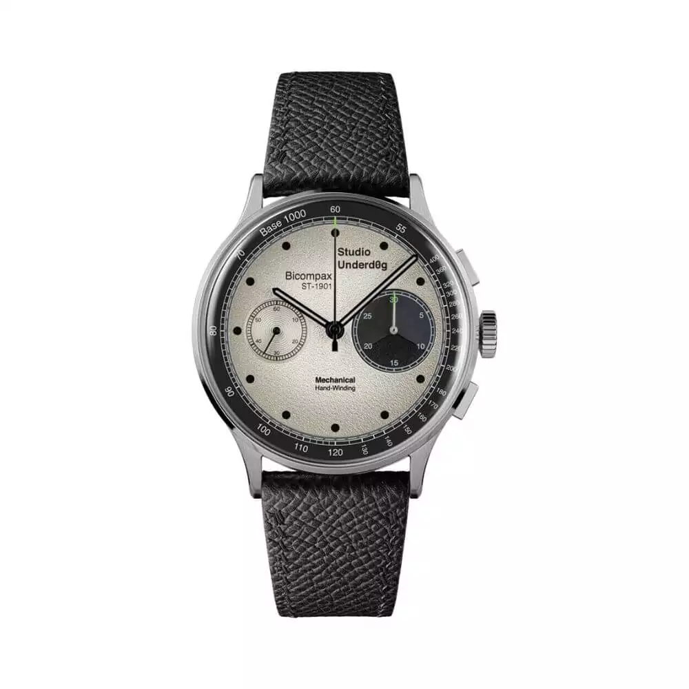 The Studio Underd0g 01GPB Goofy Panda Gen2 BiCompax ST-1901 38.5mm Unisex Watch is the perfect blend of style and functionality. With its silver bezel and black leather two-piece strap, this watch exudes a classic yet casual and luxurious vibe that suits both men and women.