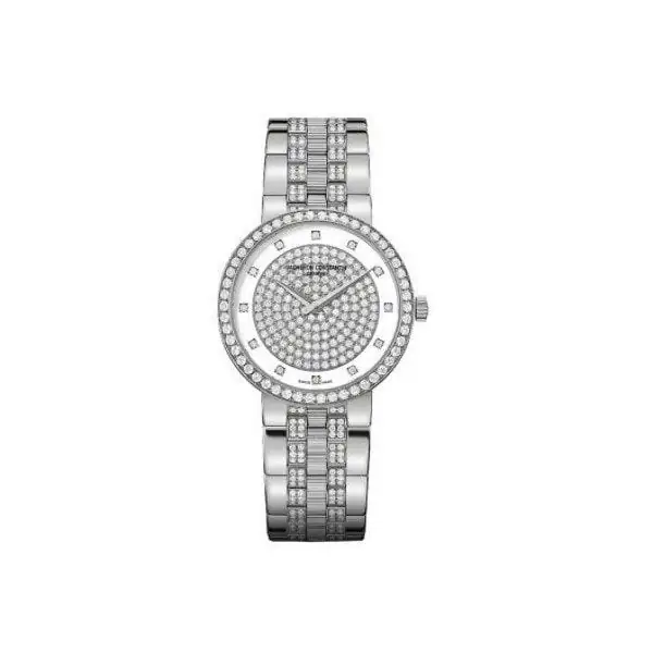 30 mm 18kt white gold case, 5.98 mm thickness, diamond dial, scratch resistant sapphire crystal, solid case back, quartz movement,?Hidden Folding Clasp, water resistant to 30m/100ft.