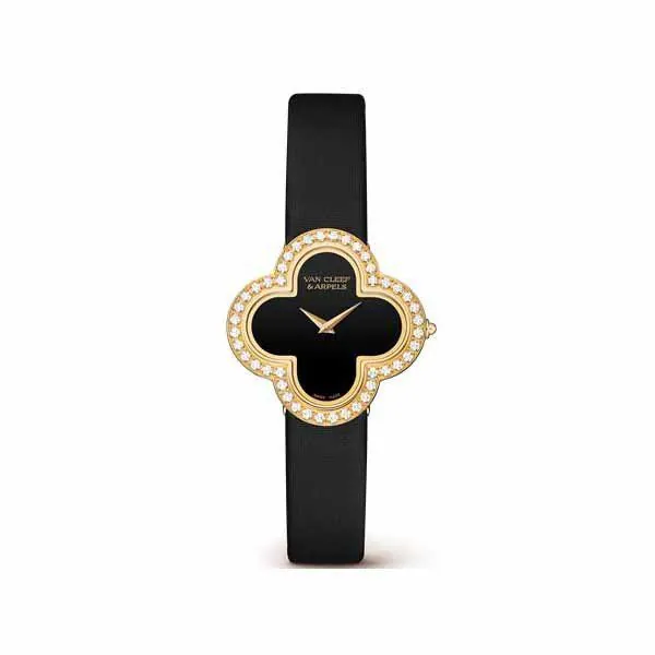 Medium model 18k yellow gold case, black satin strap, diamond bezel, onyx dial, ardillon buckle clasp, scratch resistant sapphire crystal, quartz movement, water resistant to 30m/100ft.