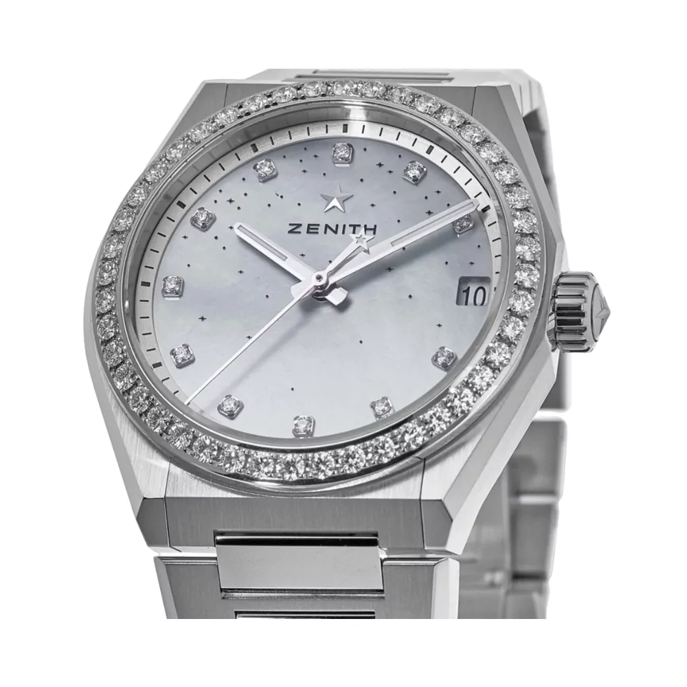 The Zenith Defy Midnight 16.9200.670/03.MI001 is a stunning watch designed for women who appreciate both style and functionality. Its stainless steel case and bracelet give it a timeless and durable look. What sets it apart is the fixed stainless steel bezel adorned with glistening diamonds, adding a touch of luxury to your wrist.