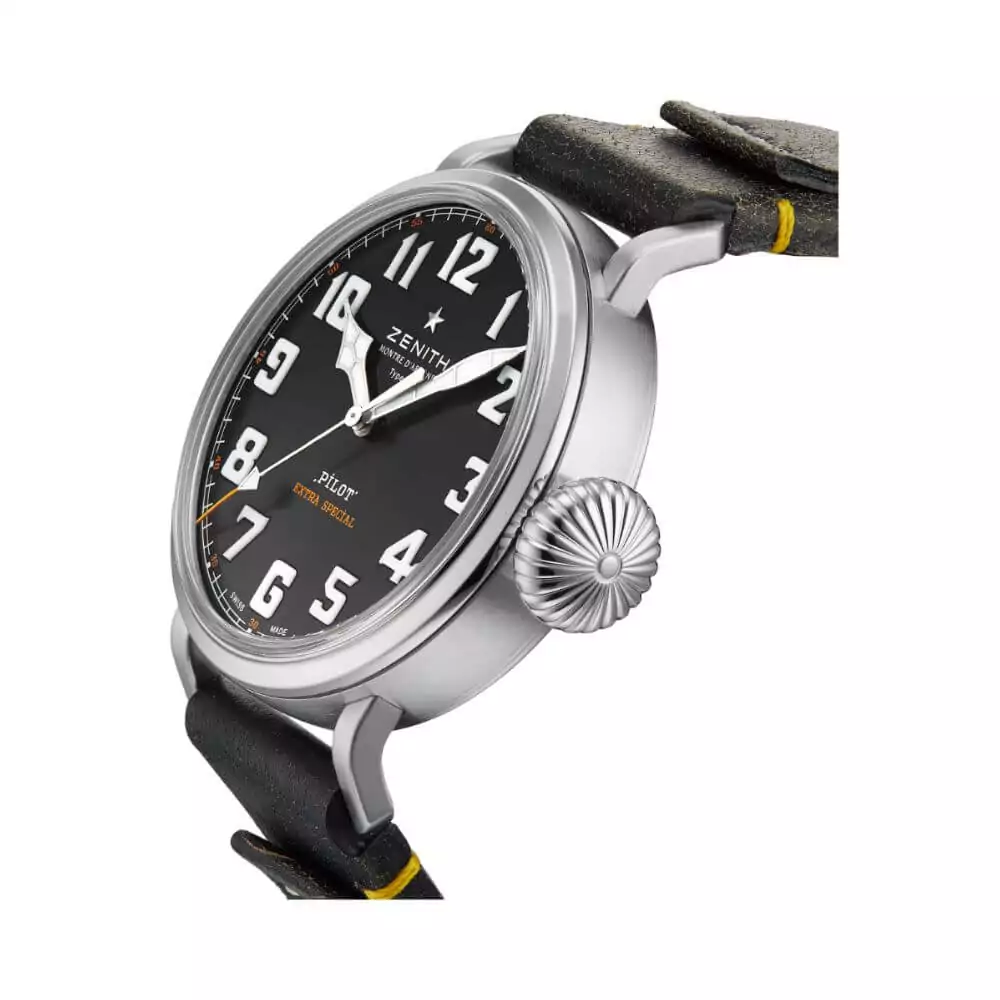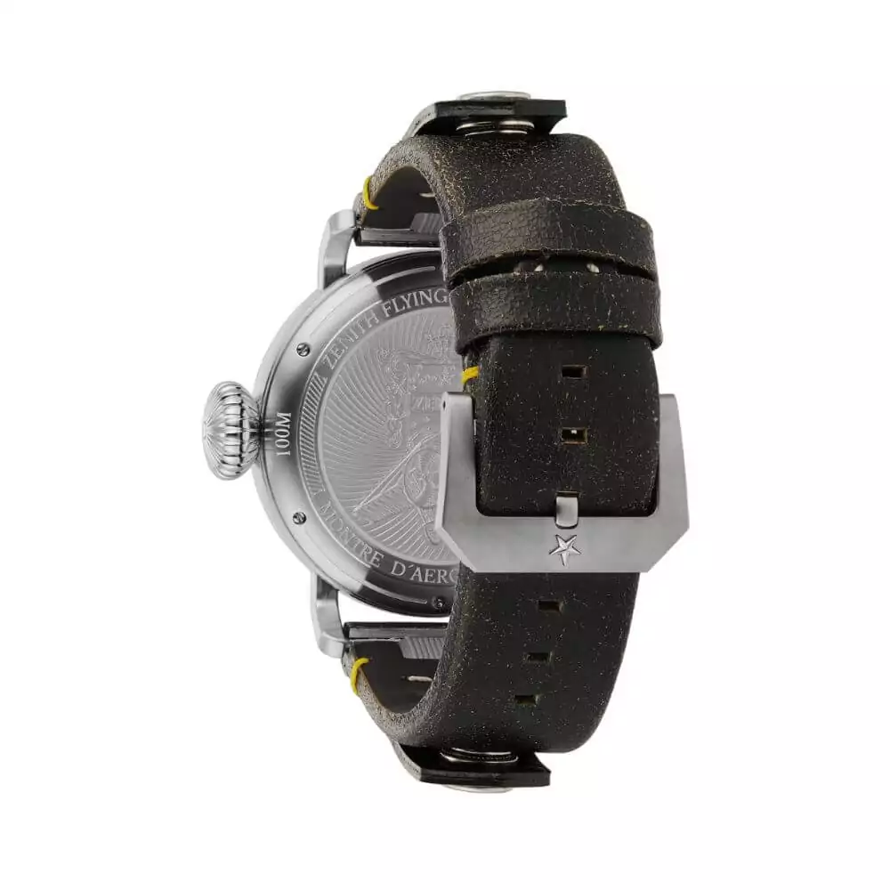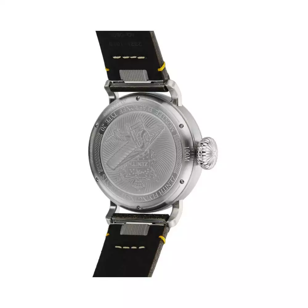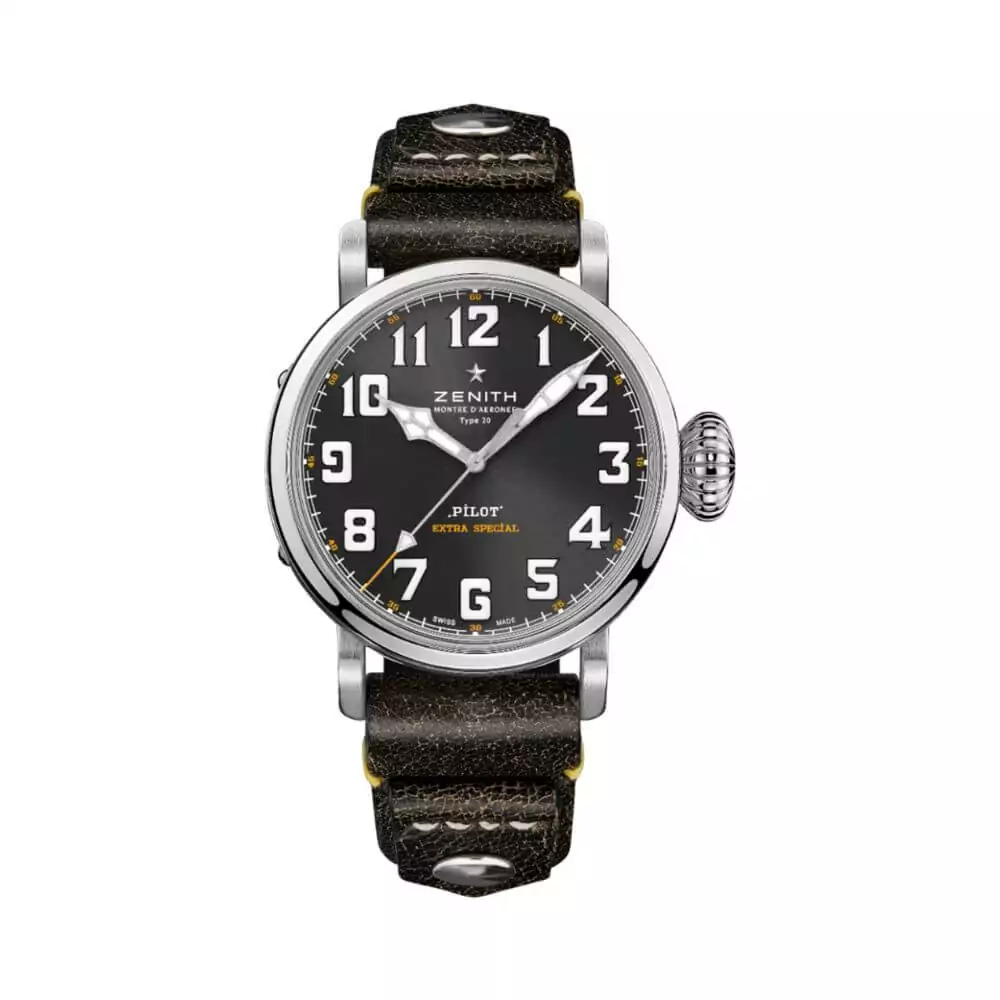 The Zenith Pilot Type 20 features a round stainless steel case with a diameter of 45mm. Its grey dial is adorned with Arabic numerals, adding a touch of vintage charm to the design. The anti-reflective scratch-resistant sapphire crystal ensures that your watch remains pristine even in the toughest conditions.